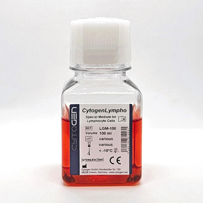 Das CytogenLympho Medium wird tiefgefroren und gebrauchsfertig geliefert. Es enthält Basalmedium, vorgetestetes fötales Rinderserum (FBS), Phytohämagglutinin als Mitogen, L-Glutamin, Penicillin/Streptomycin als Antibiotikum sowie Phenolrot als pH-Indikator. Dank der homogenen "ready to use"-Formulierung werden technische Fehler und Kontaminationsrisiken in der Kultur minimiert.